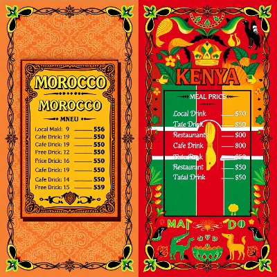 모로코는 타진(Tajine), 쿠스쿠스(Couscous), 하리라(Harira) 같은 전통 요리를 저렴하게 즐길 수 있습니다. 로컬 레스토랑이나 시장에서는 3~6 USD면 한 끼 식사가 가능합니다. 케냐에서는 우갈리(Ugali), 니얌초(Nyama Choma) 등 전통 요리를 맛볼 수 있으며, 평균 4~8 USD 수준입니다. 여행자 밀집 지역에서는 서양식 레스토랑이 많지만 가격은 10~15 USD 이상으로 상승합니다.